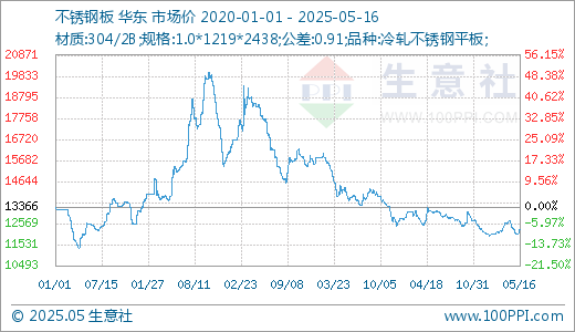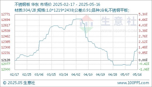 据生意社价格监测,本周不锈钢价格小幅上涨。截止5月16日,现货304/2B不锈钢平板1.0*1219*2438(公差0.91)的日均价为现报价12292.86元/吨,较周初上涨1.47%,同比下跌6.08%。