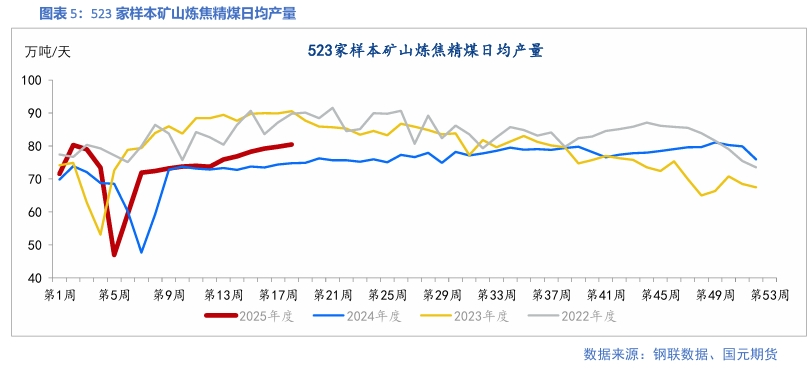 上周,523家炼焦煤矿山开工率为89.74%,周环比增加1.36个百分点;原煤日均产量为201.7万吨/天,周环比增加1.54%;精煤日均产量为80.44万吨/天,周环比增加0.88%。110家样本洗煤厂开工率为62.97%,周环比下降0.04个百分点;洗煤厂精煤日均产量为53.58万吨/天,周环比增加0.27%。