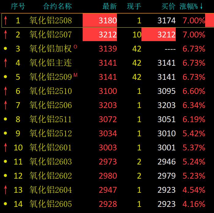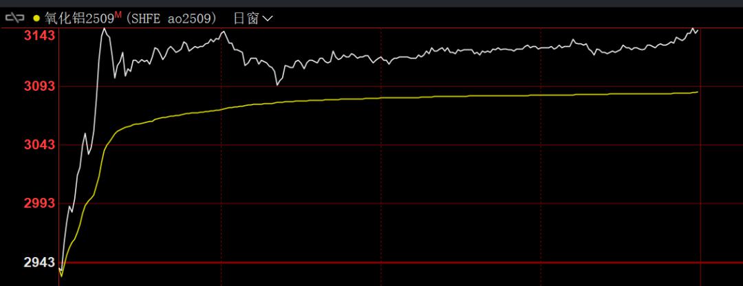5月16日夜盘,氧化铝期货高开高走,多个合约触及涨停,主力合约盘中最高涨至3149元/吨,创3月底以来新高。