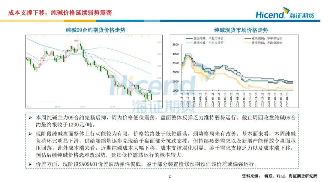 本周纯碱主力09合约先扬后抑,周内价格低位震荡,盘面整体反弹乏力维持弱势运行。截止周四收盘纯碱09合约最终报收于1330元/吨。