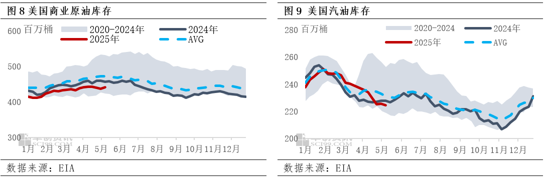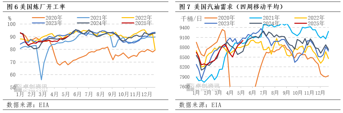 据EIA数据显示,截至5月9日当周,美国炼厂开工率环比回升1.2个百分点,延续检修季后的恢复趋势,高于近五年同期均值水平,带动原油加工量环比增加33万桶/日。虽然加工需求提升,但净进口环比增加42.2万桶/日或带动美国商业原油库存增加345.4万桶,至4.418亿桶,尚未出现明显的旺季预期下的季节性去库拐点,但库存处于低位水平。成品油方面,汽油库存减少102.2万桶至2.247亿桶,仍延续去库,汽油需求四周移动平均水平也处于近五年同期偏高位置,但汽油去库速度有所放缓。中美关税缓和使得市场对“对等关税”拖累实际需求担忧有所修复,但OPEC+增产预期叠加宏观风险使得需求偏弱背景下,“旺季可期”还是“旺季不旺”仍有待观察。
