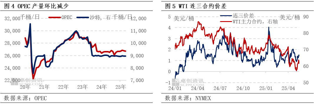 从2024年“限产保价”至2025年3月起决议逐步恢复产量,再至4月起决议加速增产,沙特为首的OPEC+出现明显政策转向。在低油价背景下“限产报价”和以量换价平衡收入、美国施压下增产维护地缘稳定以及惩罚超产成员国中,做出了明显的选择。5月OPEC+会议再度提及加速增产事宜,打压油市供需预期,供应过剩预期加重,使得油价承压。但WTI连三合约价差显示,“现实”供需矛盾有限,保持偏紧水平。OPEC月报数据也显示,由于委受制裁以及哈萨克斯坦、尼日利亚等几个成员国产量下降,4月OPEC+整体产量减少10.6万桶/日。但是往后看,哈萨克斯坦仍旧大幅超出产量配额,6月初OPEC+会议仍然存在增产预期,供应端悲观预期利空油市。
