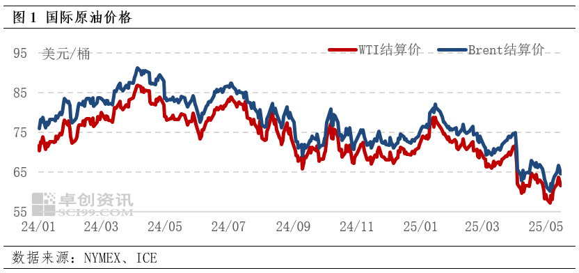 截至5月15日当周(5.9-5.15),国际油价先扬后抑,WTI主力合约结算价周均价62.28美元/桶,涨幅6.47%;Brent主力合约结算价周均价65.22美元/桶,涨幅6.01%。全面“对等关税”取得“破冰式”进展缓和市场宏观风险偏好,推动油价向上反弹修复,但供应过剩悲观预期叠加地缘风险降温限制油价涨幅。市场消化宏观利好后,油价见顶回落,保持高波动态势。