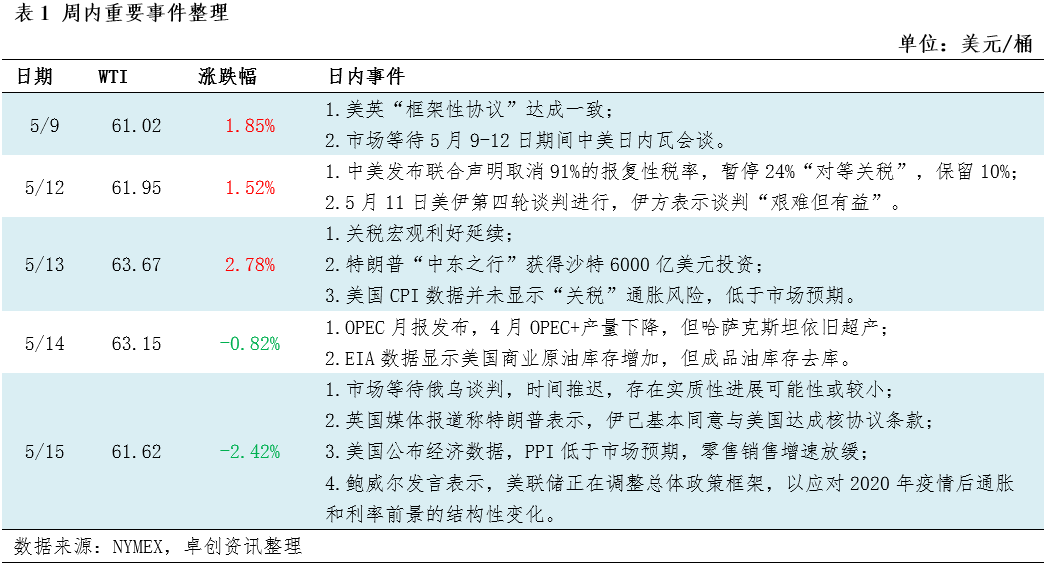 【市场回顾】周内国际油价主要围绕宏观面驱动变化,前期中美联合声明显示互加税率幅度大幅下降,“破冰式”进展缓和市场预期,提振宏观风险偏好,推动油价向上反弹修复,同时,周内美国经济数据好于市场预期也缓和“衰退”情绪。但OPEC+加速增产背景下供应过剩悲观预期叠加俄乌和美伊谈判推进中地缘风险降温限制油价涨幅。市场在消化宏观利好后,油价见顶回落,多因素扰动市场选择,保持高波动态势。
