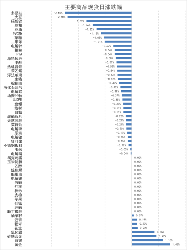 5月16日,卓创资讯监测商品现货市场36种下跌,14种企稳,8种上涨。能源化工及黑色以跌为主,贵金属再度领涨,新能源板块商品领跌,豆系现货跌势延续,跌幅扩大。(价格涨跌幅均以卓创资讯监测现货商品均价或主流市场价格计算)