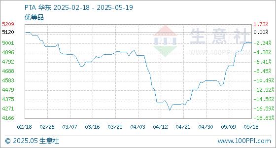 5月19日,生意社PTA基准价为5007.50元/吨,与本月初(4584.38元/吨)相比,上涨了9.23%。