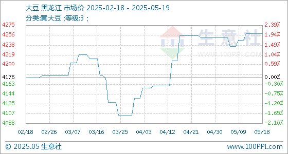 5月19日,生意社大豆基准价为4260.00元/吨,与本月初(4252.00元/吨)相比,上涨了0.19%。
