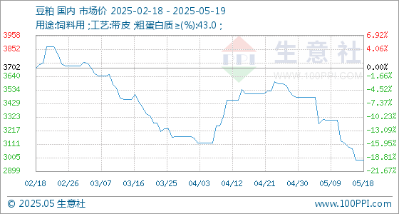 5月19日,生意社豆粕基准价为2988.00元/吨,与本月初(3476.67元/吨)相比,下降了-14.06%。