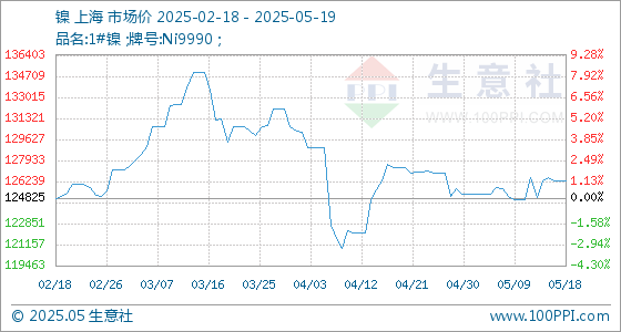 5月19日,生意社镍基准价为126258.33元/吨,与本月初(125175.00元/吨)相比,上涨了0.87%。