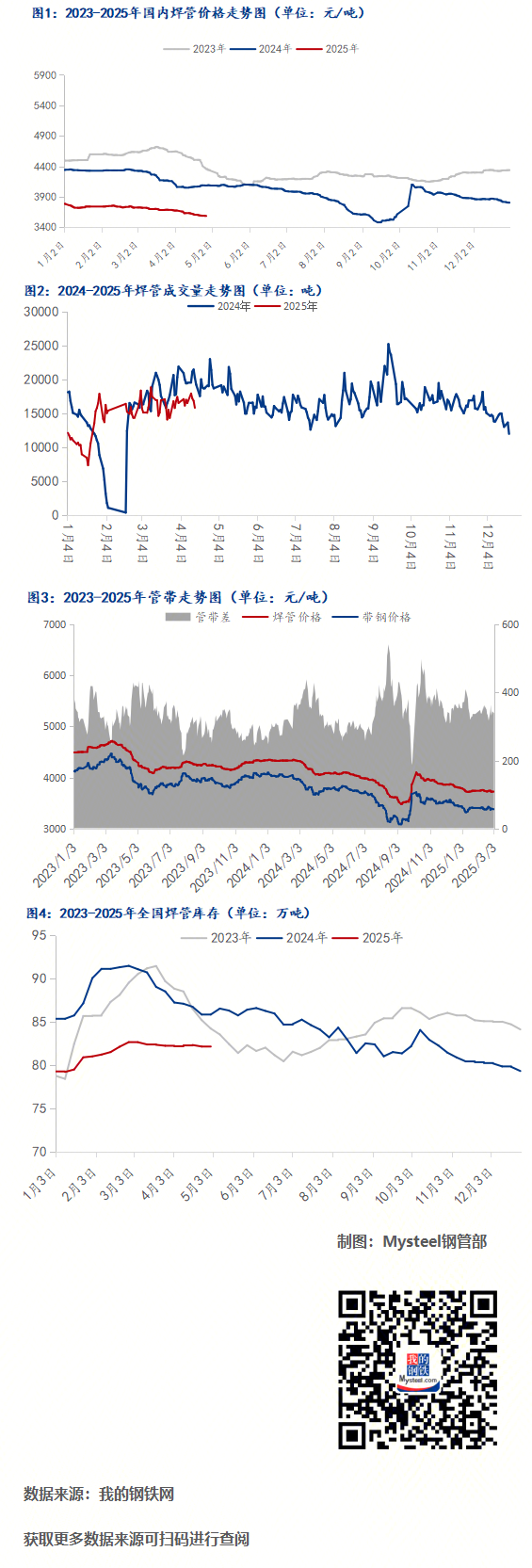 上周焊管均价小幅上涨,不过多地焊管价格仍表现为易跌难涨。随着降低关税政策的落地以及降准消息落地,市场情绪有所修复,不过现货市场卖方市场仍是影响价格上行的重要因素,多地市场价格跟涨有限。周五原料端价格开始回落,对焊管支撑性减弱,叠加需求动力不足,预计今日全国焊管市场价格或持稳运行。
