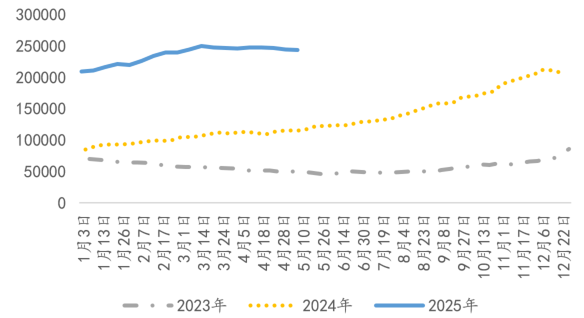 供应方面,精炼镍供应维持高位,据SMM数据,4月全国精炼镍产量3.63万吨,同比增加47.26%。成交方面,除清明节后第一周镍价超跌刺激下游积极补库外,精炼镍现货成交氛围整体偏淡,下游以逢低刚需采购为主。在不锈钢领域,地产市场缓慢修复,传统需求淡季叠加买单出口整治和关税影响,不锈钢市场需求表现不佳,并且负反馈压力使得原料镍铁价格持续下跌至940元/镍。在三元电池领域,3月我国动力电池总装车量56.6GWh,环比增长62.3%,同比增长61.8%,其中,三元电池装车量10.0GWh,占总装车量的17.7%,环比增长55.2%,同比下降11.6%。磷酸铁锂电池性价比优势显著,三元电池市占率持续缩减,加上关税等贸易壁垒使出口受阻,三元电池领域需求难有起色。电镀及合金领域则表现平稳,月度耗镍量变化低于1%。库存方面,自2023年下半年以来,海内外精炼镍库存维持趋势性累库,不过近期精炼镍供需矛盾并无进一步凸显,社会库存增速边际放缓。截至5月2日,我国精炼镍社会库存4.37万吨,周环比下降1%,同比增加24%;截至5月6日,LME镍库存为20万吨,周环比下降0.7%,同比增加150.4%。