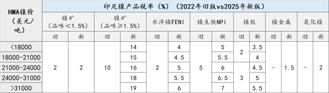 镍PNBP为印尼政府针对镍矿资源开采和加工环节征收的特许权使用费。4月26日,印尼镍PNBP新政策正式实施,该政策将镍矿(品味≥1.5%)税率从固定10%调整为14%-19%,水淬镍税率从固定2%调整为4%-6%,镍生铁税率由固定5%调整为5%-7%,镍锍税率从2%调整为3.5%-5.5%,并且新增了对镍金属1.5%的税费。