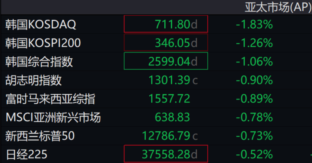 日韩股市下跌。截至发稿,韩国综合指数跌超1%,日经225指数跌幅为0.52%。