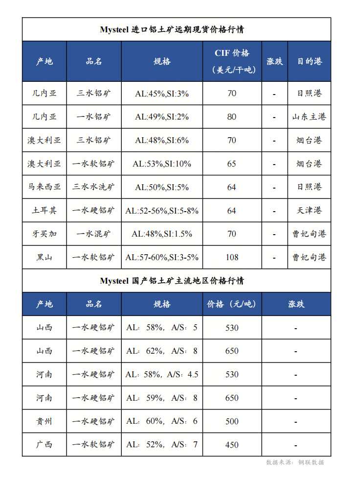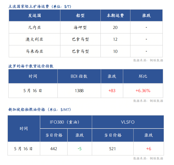 5月19日铝土矿价格暂时持稳,但受到几内亚政策影响,少数矿山处于停产状态,何时复产目前未知,一定程度上为进口铝土矿价格上涨提供了可能性。