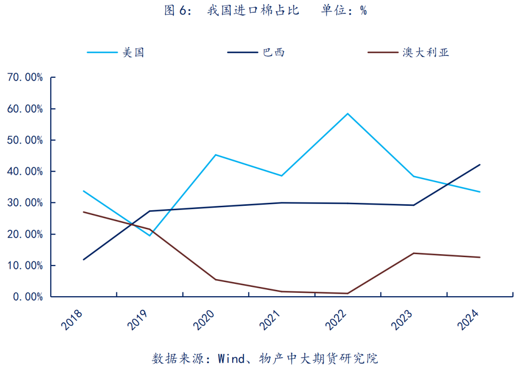 进口端表现上,2024年巴西棉占我国进口棉花的占比已超越美国,在贸易摩擦之后,这样的趋势或将得以加速。近年来美国棉花产量已逐渐低于巴西棉花产量,使得巴西在可出口的总量上跃居世界第一。另外值得关注的可替代进口资源是澳大利亚棉花,2024年我国已取消对澳大利亚的贸易制裁,中澳贸易关系逐步缓和,使得澳棉进口成为我国美棉进口减少后可选择的补充。因此,进口结构变化的演变进度较快,使得国内供应端受到本次贸易摩擦的影响并不大。