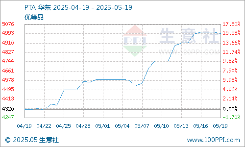 据生意社商品行情分析系统,5月以来国内PTA现货市场行情呈现震荡上行走势。截止5月19日华东地区市场均价在4993元/吨,较月初上涨8.93%。
