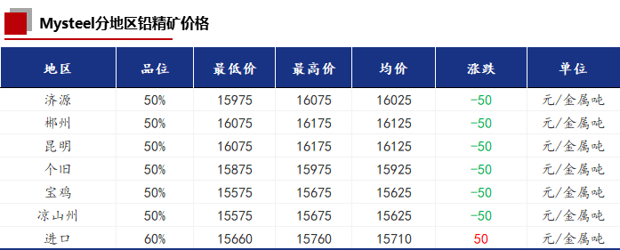今日受铅价的影响,铅精矿价格较上一交易日跌50元/金属吨。国内铅精矿加工费各地区均未调整,和上一交易日持平。进口铅精矿价格上涨50元/金属吨。