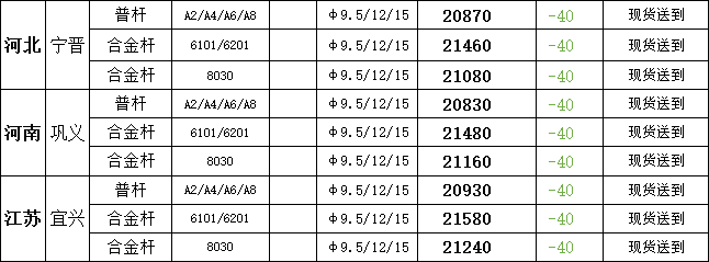 5月19日宁晋市场普铝杆现货报盘价20870元/吨,较上一交易日报价跌40元/吨;巩义市场普铝杆现货报盘价20830元/吨,较上一交易日报价跌40元/吨;宜兴市场普铝杆报盘价20930元/吨,较上一交易日报价跌40元/吨。