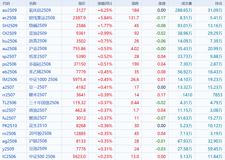 5月19日,午盘收盘,国内期货主力合约多数下跌。氧化铝涨超6%,集运欧线涨超5,烧碱涨超1%;跌幅方面,焦煤、碳酸锂跌超2%,纯碱、工业硅、尿素、焦炭、甲醇跌超1%。