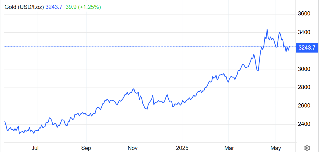 在周一,黄金在经历了六个月来最大的周跌幅后,黄金现货价格小幅反弹至每盎司3240美元以上,市场对美国经济前景和预算赤字的日益增长担忧情绪推动了人们对避险资产的投资兴趣。在上周五,穆迪评级下调了美国政府的信用评级,失去了三大信用评级机构中唯一的AAA评级,核心理由是财政赤字巨大和利息成本不断上升。上周,金价暴跌超过3%,创下自11月以来的最差单周表现,因为中美两国在贸易层面的积极共识所带来的风险偏好扩张使得黄金市场持续下行。