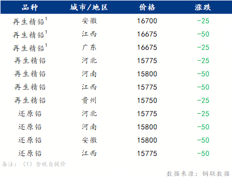 湖南市场A企业再生精铅含税价16595元/吨出厂少量成交,反映下游接货意愿较差,大贴水成交依旧欠佳。