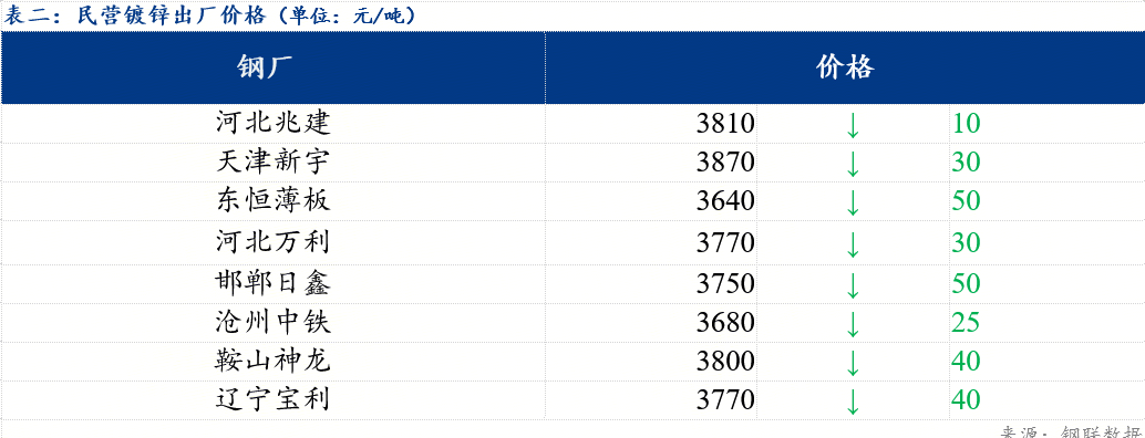 今日北方民营钢厂镀锌出厂指导价在3640元/吨-3870元/吨。