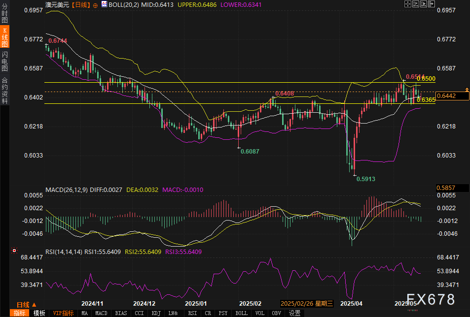 日线图显示,澳元兑美元目前处于布林带中轨附近,自四月中旬以来形成了明显的震荡整理格局。汇价近期围绕0.6365至0.65区间盘整,显示市场处于蓄势阶段。