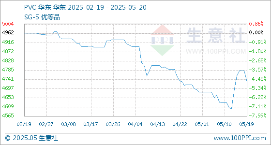 5月20日,生意社PVC基准价为4726.00元/吨,与本月初(4679.00元/吨)相比,上涨了1.00%。