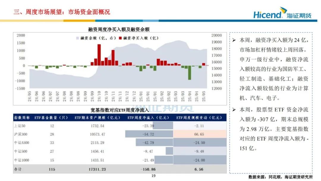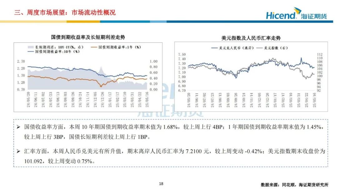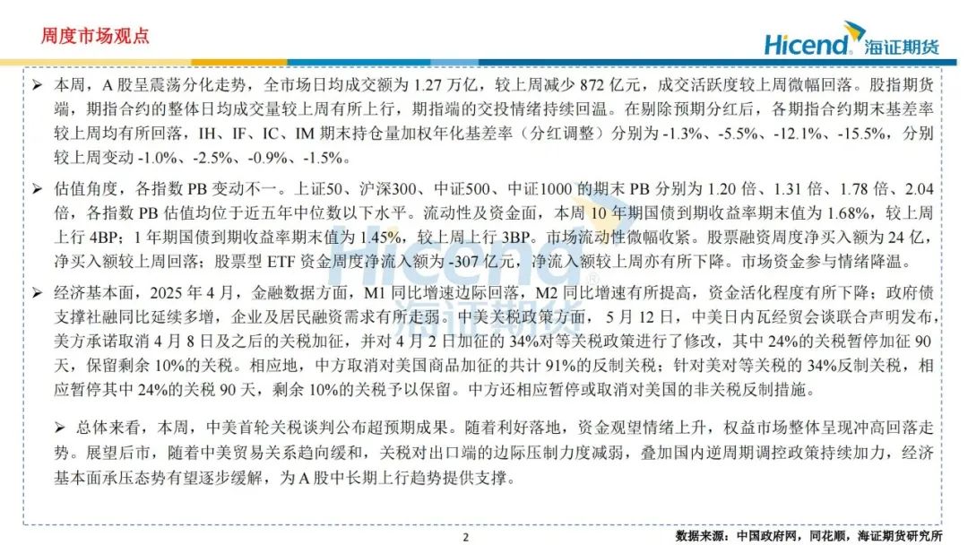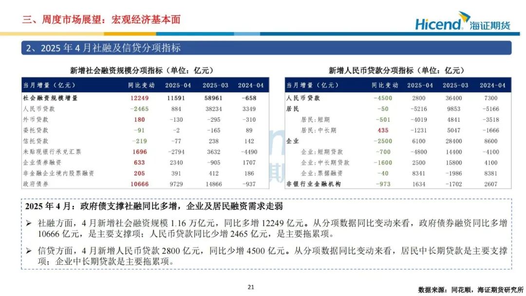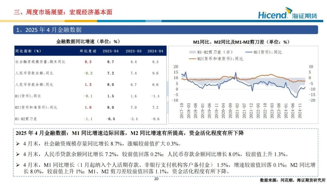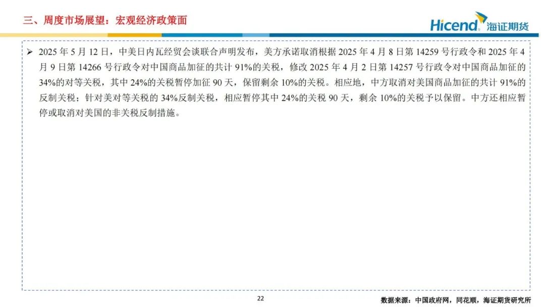 经济基本面,2025年4月,金融数据方面,M1同比增速边际回落,M2同比增速有所提高,资金活化程度有所下降;政府债支撑社融同比延续多增,企业及居民融资需求有所走弱。中美关税政策方面,5月12日,中美日内瓦经贸会谈联合声明发布,美方承诺取消4月8日及之后的关税加征,并对4月2日加征的34%对等关税政策进行了修改,其中24%的关税暂停加征90天,保留剩余10%的关税。相应地,中方取消对美国商品加征的共计91%的反制关税;针对美对等关税的34%反制关税,相应暂停其中24%的关税90天,剩余10%的关税予以保留。中方还相应暂停或取消对美国的非关税反制措施。