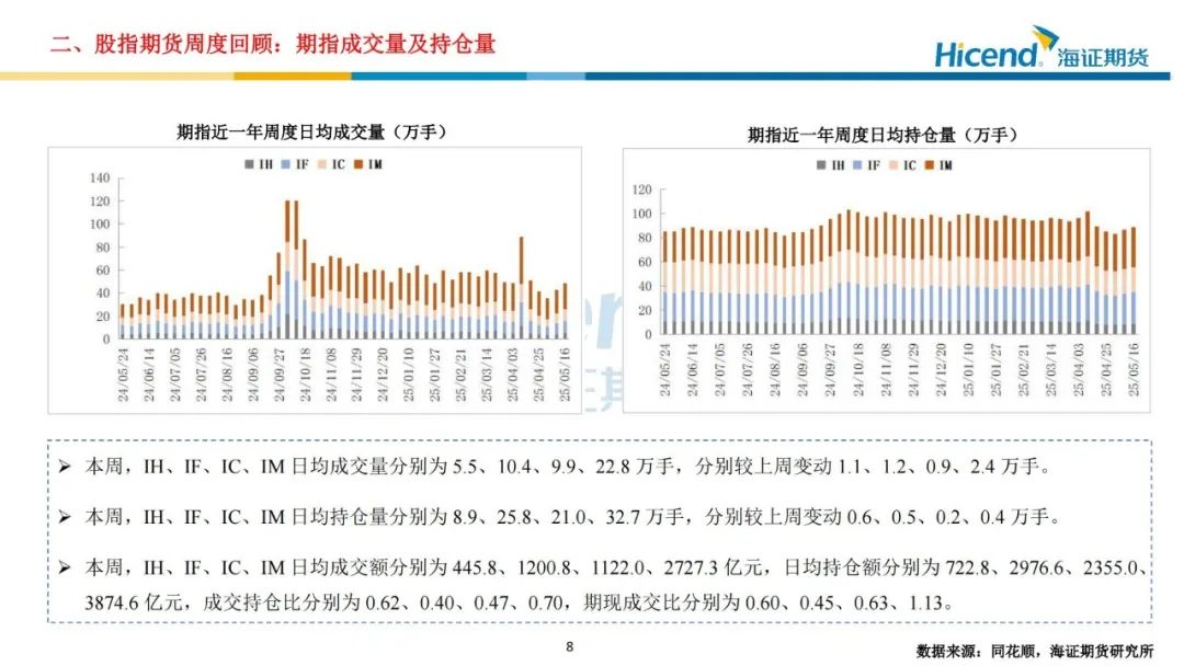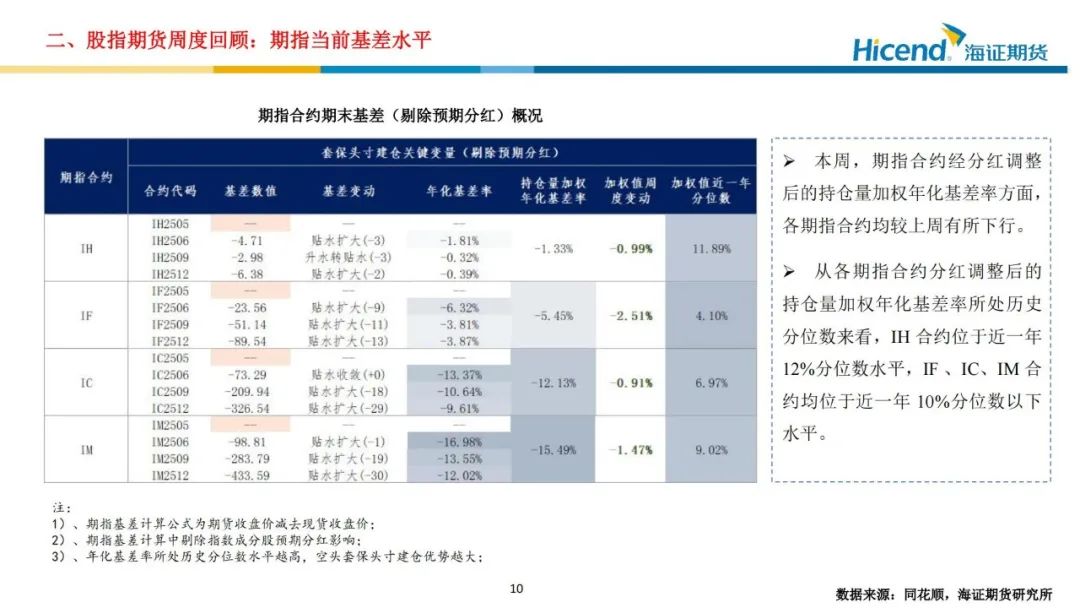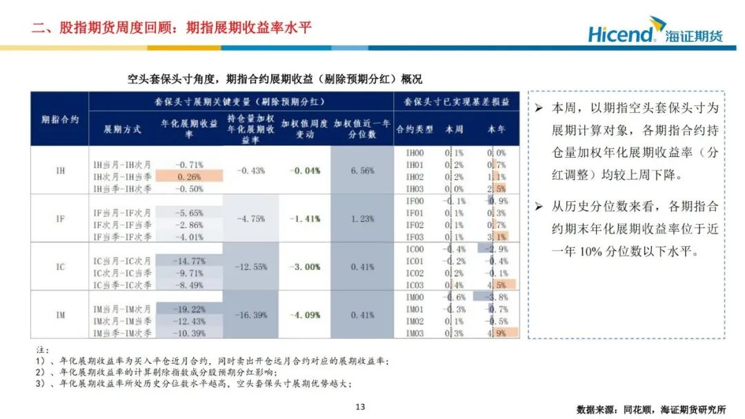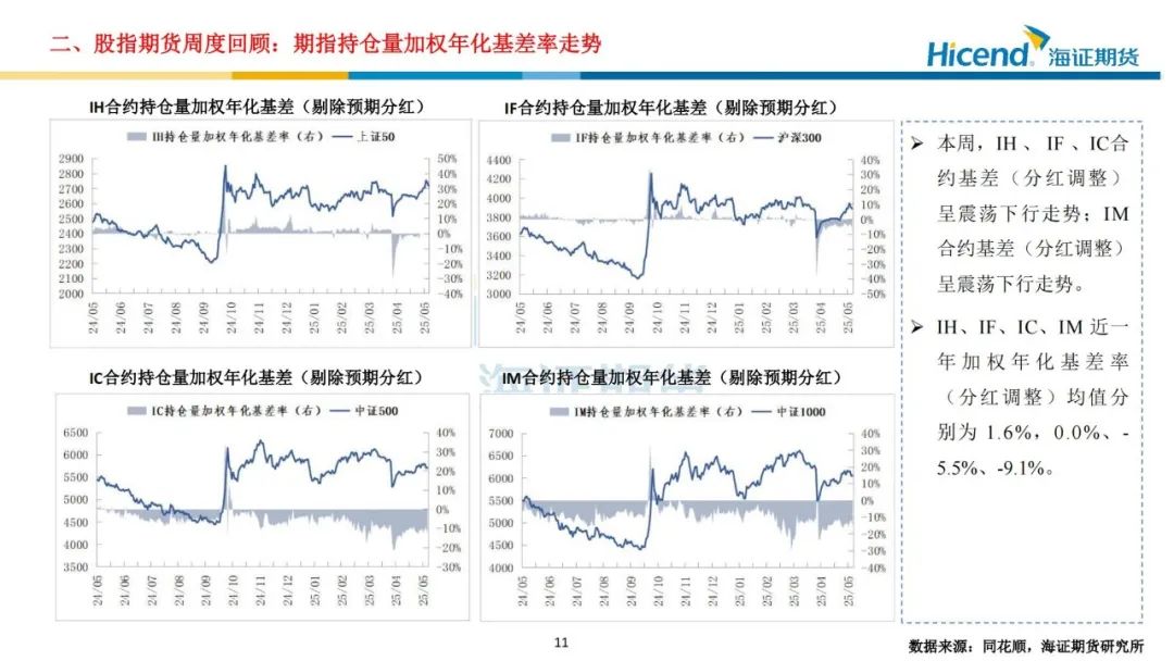 本周,A股呈震荡分化走势,全市场日均成交额为1.27万亿,较上周减少872亿元,成交活跃度较上周微幅回落。股指期货端,期指合约的整体日均成交量较上周有所上行,期指端的交投情绪持续回温。在剔除预期分红后,各期指合约期末基差率较上周均有所回落,IH、IF、IC、IM期末持仓量加权年化基差率(分红调整)分别为-1.3%、-5.5%、-12.1%、-15.5%,分别较上周变动-1.0%、-2.5%、-0.9%、-1.5%。