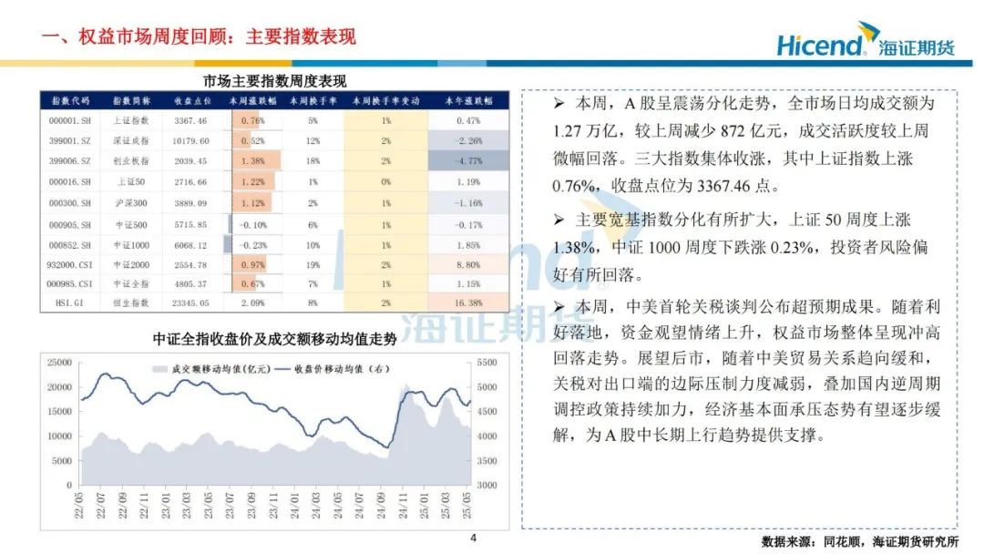 总体来看,本周,中美首轮关税谈判公布超预期成果。随着利好落地,资金观望情绪上升,权益市场整体呈现冲高回落走势。展望后市,随着中美贸易关系趋向缓和,关税对出口端的边际压制力度减弱,叠加国内逆周期调控政策持续加力,经济基本面承压态势有望逐步缓解,为A股中长期上行趋势提供支撑。