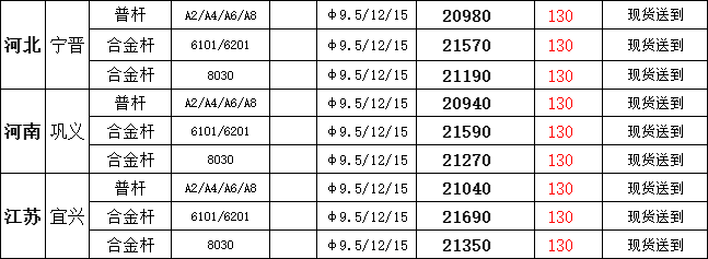5月15日宁晋市场普铝杆现货报盘价20980元/吨,较上一交易日报价涨130元/吨;巩义市场普铝杆现货报盘价20940元/吨,较上一交易日报价涨130元/吨;宜兴市场普铝杆报盘价21040元/吨,较上一交易日报价涨130元/吨。