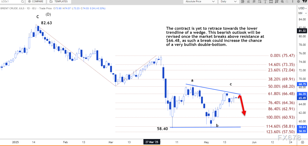 日线图上,该合约尚未回撤至楔形的下行趋势线。一旦市场突破66.48美元的阻力位,这种看跌预期将被修正,因为突破该阻力位可能会增加形成强势双底形态的可能性。