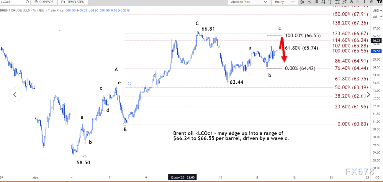 路透技术分析师指出,受 c 浪推动,布伦特原油可能小幅上涨至每桶 66.24 美元至 66.55 美元的区间。