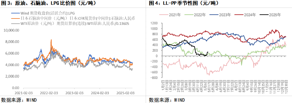 目前从图3不难看出,LPG估值远高于原油和石脑油,因此即使6月OPEC+会议决定增产导致原油价格下降,那么LPG作为高估值品种应该跌幅更多,从而驱动PP更大幅度下跌,最终传导LL-PP价差走阔。