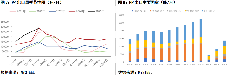 2024年随着PP出口量同比翻倍,多年来PP出海的口号终于落地,月均出口量同比接近翻倍至18万吨/月,成为PP去年看多因素中最为重要的边际变量。而今年受美国“关税制裁”政策波动的影响,PP出口量较去年有所回落,PP看多因素落空或更将支持LL-PP价差做多。