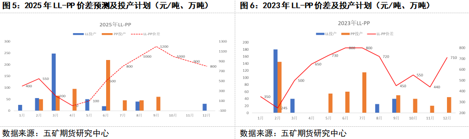 根据行业最新投产数据显示,PP09合约全部投产计划高达370万吨,且其中6月有近220万吨,反观LL全年仅剩140万吨计划投放产能,且6月仅20万吨产能待投放,因此对比2023年上半年投产错配情况,2023年5月-7月PP计划投产230万吨,LL0万吨,LL-PP09合约从245元/吨上涨至800元/吨。而今年6月的投产错配与2023年十分相似,尤其是6月的200万吨产能错配,因此预计5月底6月初开始交易LL-PP价差走阔预期,7月-9月交易产能落地及季节性旺季放大LL-PP价差至高点。