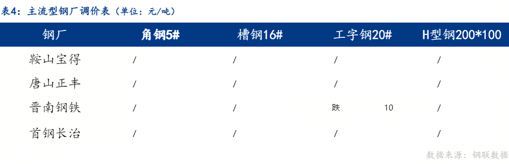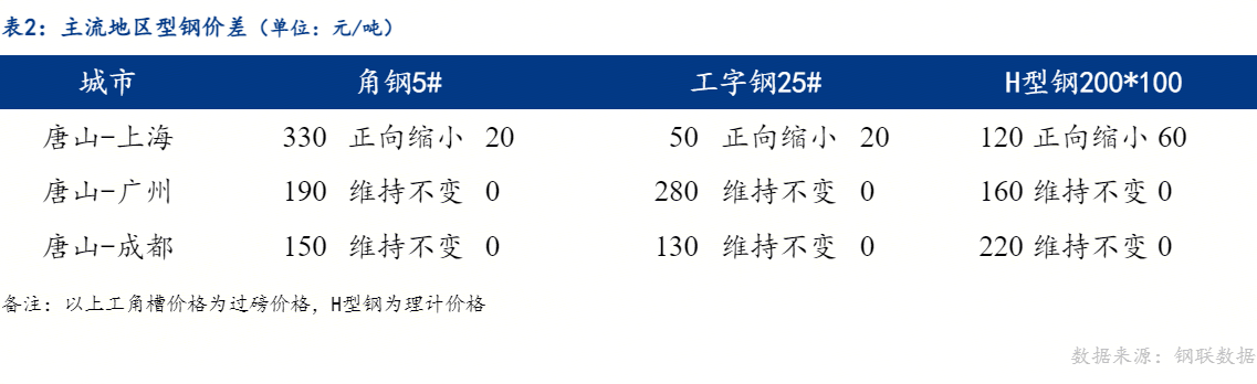 从区域价差来看,唐山与上海角钢、工字钢、H型钢价差正向缩小;唐山与广州、成都角钢、工字钢、H型钢价差维持不变。