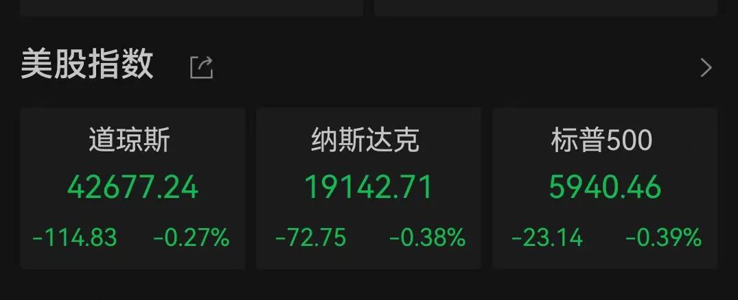 截至收盘,标普500指数跌0.39%,报5940.46点;纳斯达克综合指数跌0.38%,报19142.71点;道琼斯工业平均指数跌0.27%,报42677.24点。