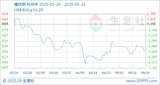 5月21日生意社螺纹钢基准价为3158.78元/吨