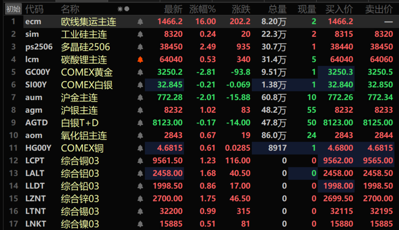 此外,碳酸锂主连涨0.53%,多晶硅主连涨2.49%,工业硅主连涨0.24%。欧线集运主连“狂飙”,最终以16%的涨停幅度报收。