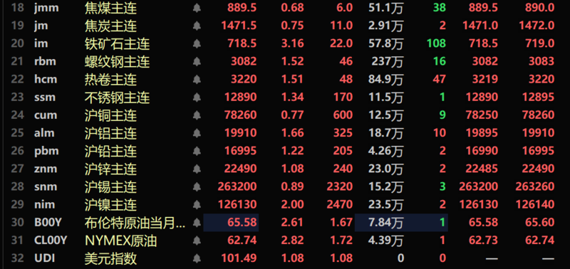 黑色系集体上扬,螺纹、热卷分别涨1.52%、1.51%,铁矿涨3.16%,热卷涨1.51%,双焦方面,焦炭涨0.75%,焦煤涨0.68%。