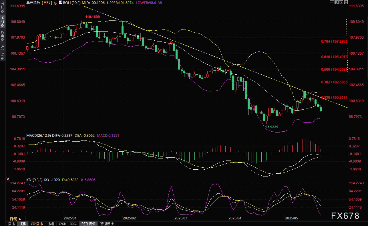 汇通财经APP讯——全球外汇市场正经历着惊心动魄的波动浪潮。周三(5月21日)交易时段,美元指数延续跌势至99.42关口,创下自5月7日以来的三周最低点,单日跌幅高达0.58%。虽然尾盘略有回升至99.55附近,但这已是美元连续第三日呈现颓势。市场观察人士指出,这场美元危机的导火索,直接指向华盛顿政治圈的一场关键博弈——特朗普总统力推的全面减税法案在共和党内部遭遇顽固派阻击,这场立法僵局正在动摇全球投资者对美元资产的信心。