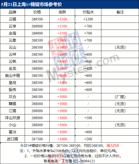 5月21日Mysteel上海现货锡锭报价267500-269500元/吨,均价268500元/吨,较上一交易日涨3250元/吨。Mysteel15:30上海现货锡锭成交价格267500-269000元/吨,均价268250元/吨,较上一交易日涨3250元/吨。