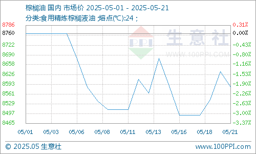 据生意社商品行情分析系统显示:5月以来,国内棕榈油行情继续弱势下跌,跌幅超2%。5月1日,棕榈油市场均价8760元/吨,5月21日,棕榈油市场均价8584元/吨,价格下跌2.01%。