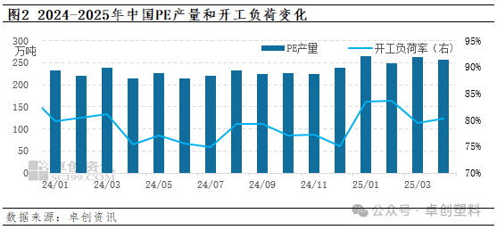 从整体来看,2025年4月份PE开工负荷率在80.3%,较去年同期提升4.87个百分点,开工负荷较3月相比亦呈上升的趋势,提升0.99个百分点。