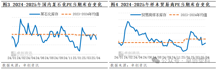 据卓创资讯数据监测,截至2025年4月底,中国某石化企业PE库存较去年同期下降2.36万吨,降幅在10.09%,样本贸易企业PE库存较去年同期下降2.35万吨,降幅在12.73%,库存水平较2024年同期相比均呈下降趋势,然中国某石化企业库存较3月相比呈小幅增加的趋势,增加较小,样本贸易企业库存较3月相比呈下降趋势。月内中国某石化企业库存呈先增后降的趋势,样本贸易企业库存呈先降后增的趋势,库存水平都在均值以下运行。