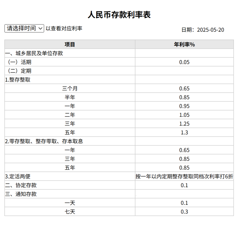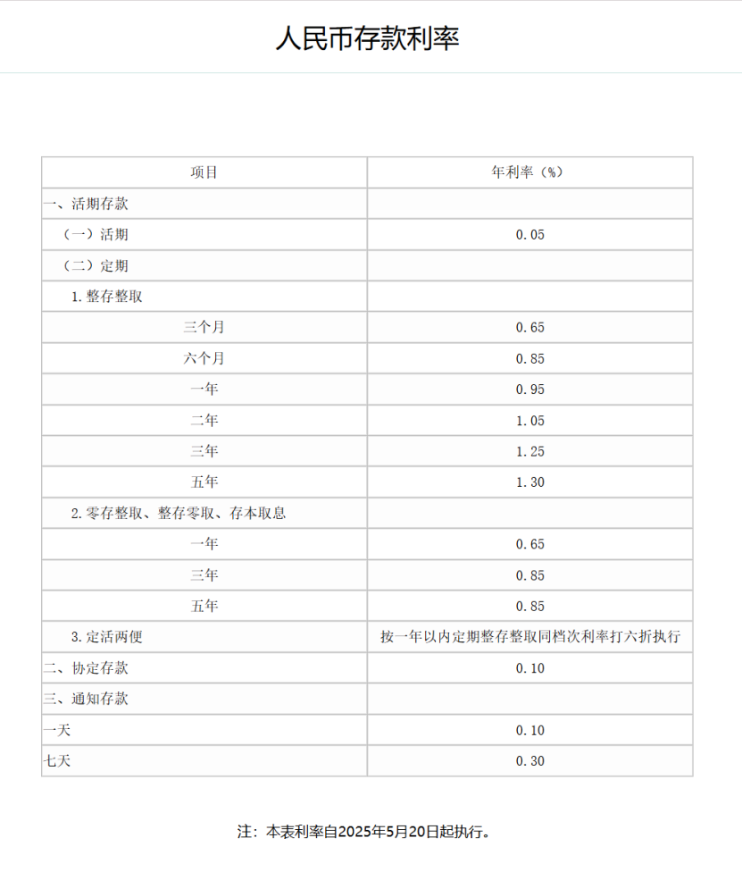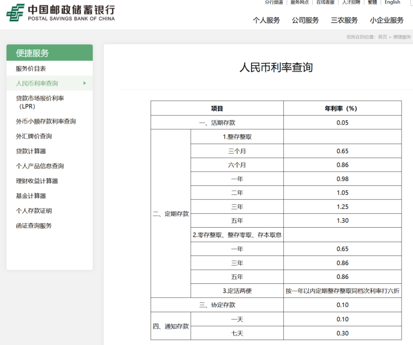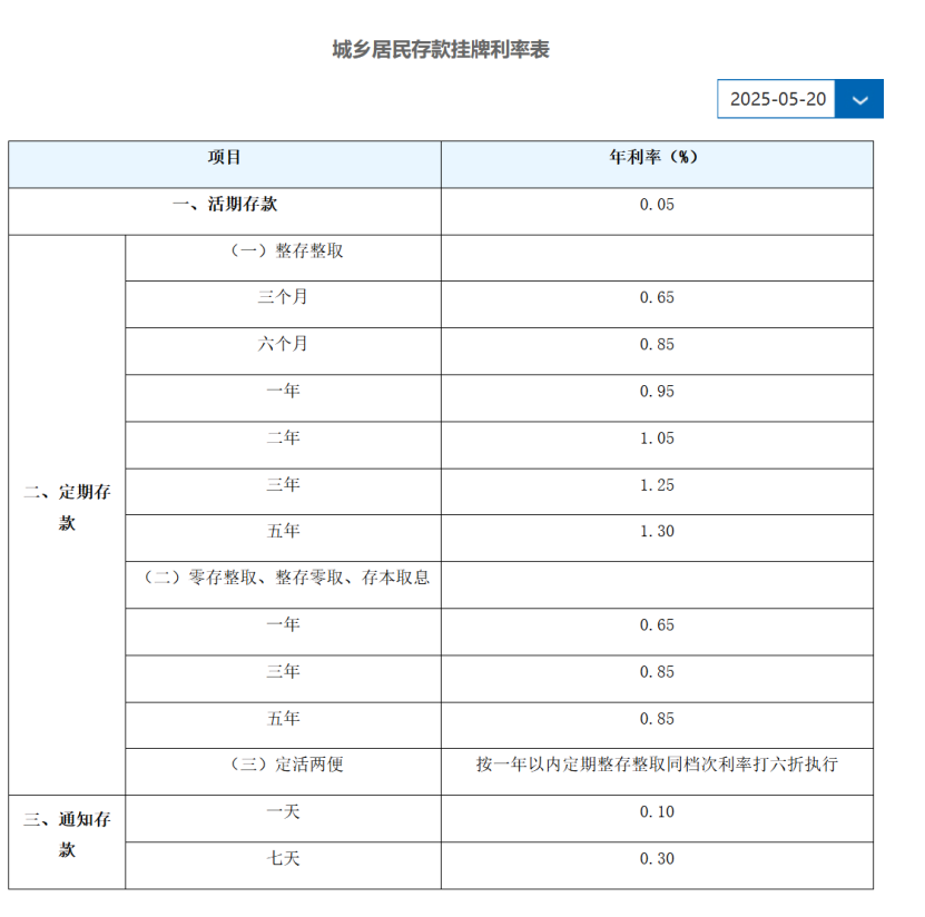 邮储银行于5月20日对多个期限的人民币存款利率进行了下调,其中活期存款利率下调至0.05%;定期三个月期、半年期、一年期、三年期和五年期均有下调,分别为0.65%、0.86%、0.98%、1.25%和1.30%。