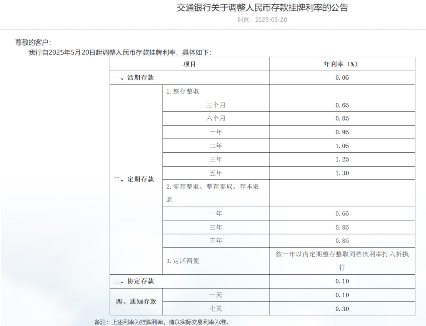 交通银行于5月20日下调人民币存款利率,其中活期利率下调5个基点至0.05%;定期整存整取三个月期、半年期、一年期、二年期均下调15个基点,分别为0.65%、0.85%、0.95%、1.05%;定期整存整取三年期和五年期均下调25个基点,分别至1.25%和1.3%。定期零存整取、整存零取、存本取息三种期限均下降15个基点。7天期通知存款利率下调15个基点至0.3%。