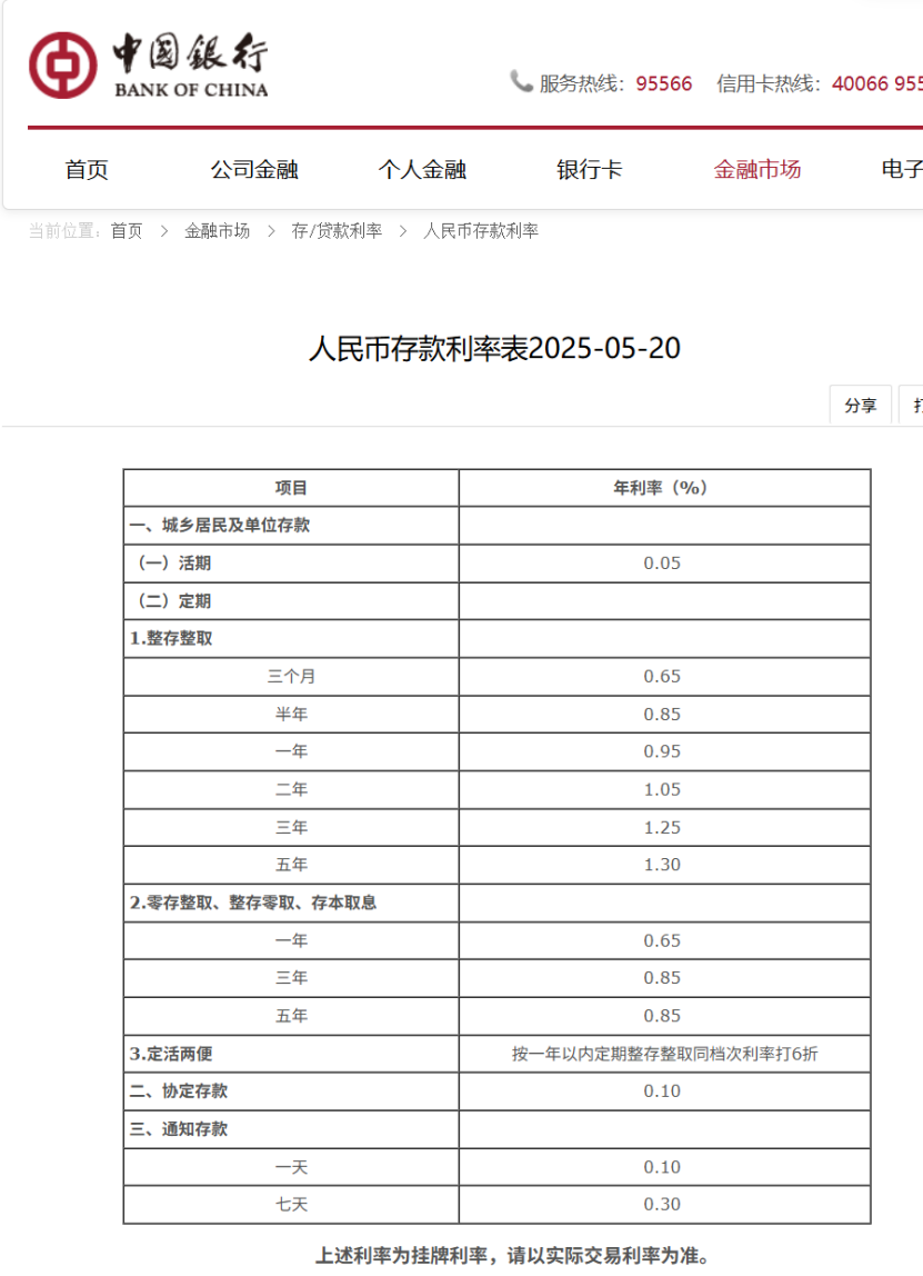 中国银行于5月20日下调人民币存款利率,其中活期利率下调5个基点至0.05%;定期整存整取三个月期、半年期、一年期、二年期均下调15个基点,分别为0.65%、0.85%、0.95%、1.05%;三年期和五年期均下调25个基点,分别至1.25%和1.3%。定期零存整取、整存零取、存本取息三种期限均下调15个基点。7天期通知存款利率下调15个基点至0.3%。